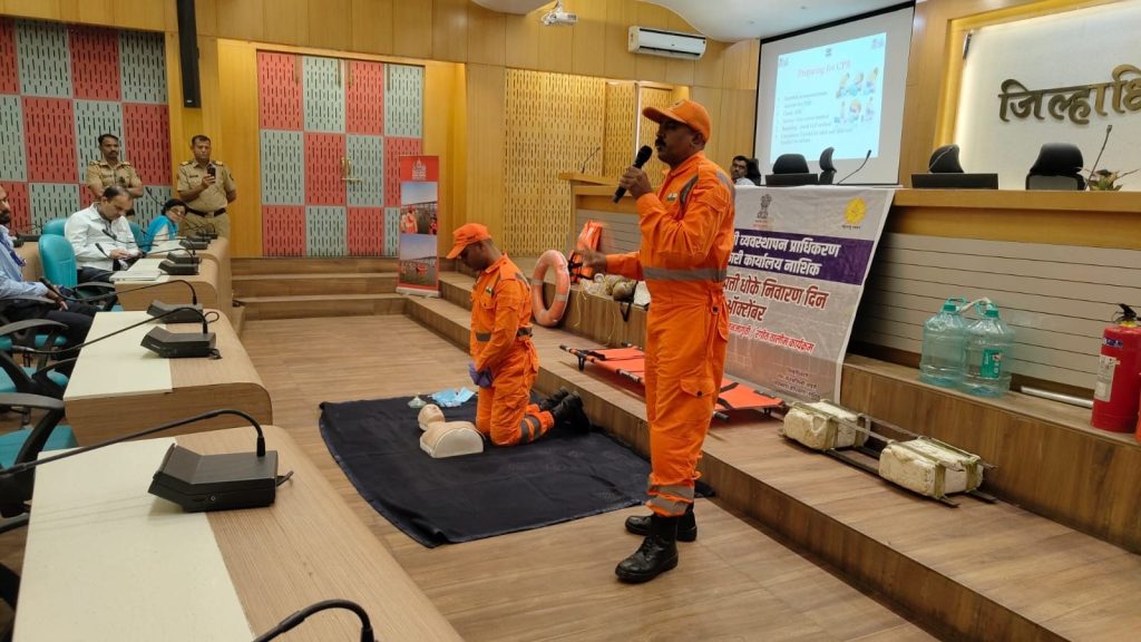 Training and practical session on MRF, CPR, and emergency response conducted by the NDRF team from Pune during the disaster preparedness programme organized by DDMA Nashik.