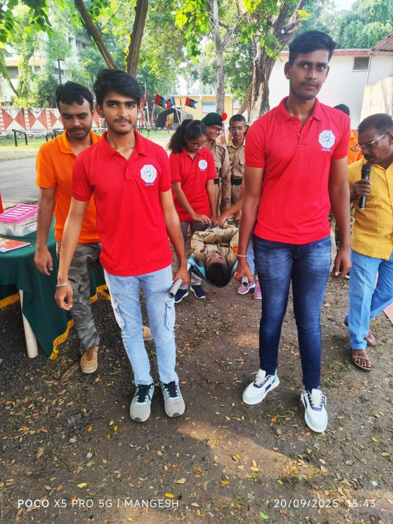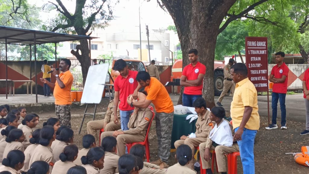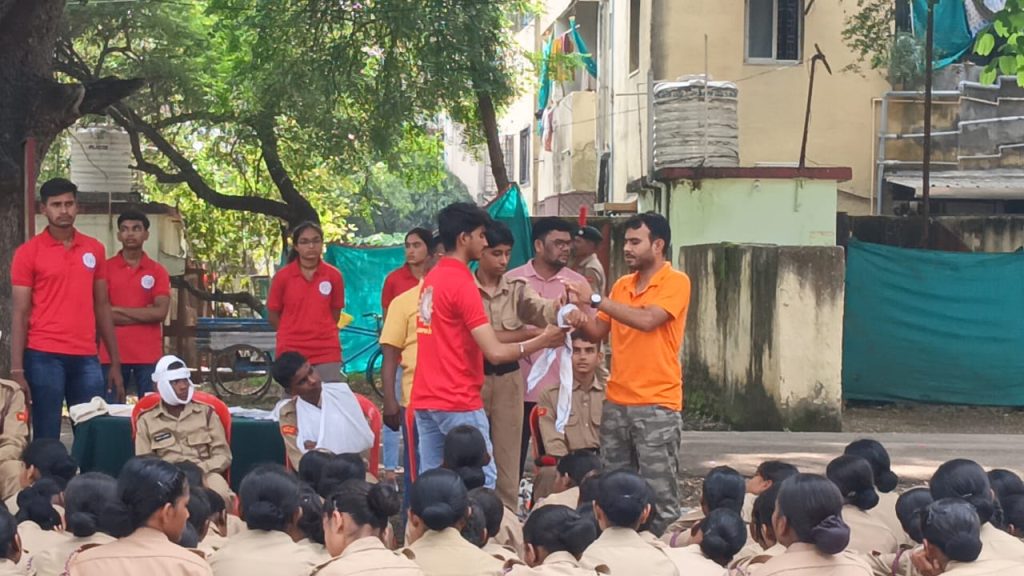 Trainers guiding NCC cadets on first aid response techniques as part of the disaster management training session in Akola.