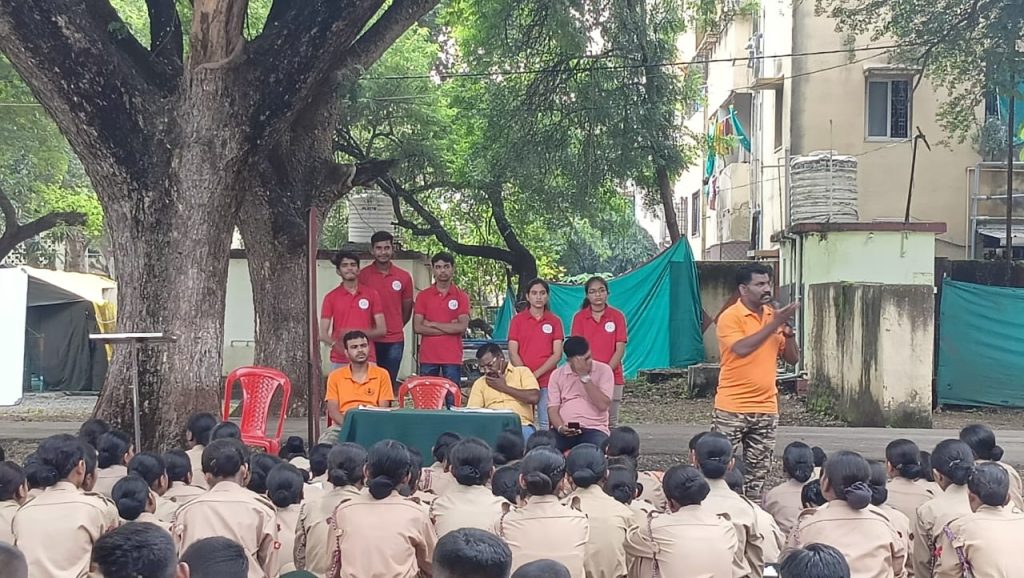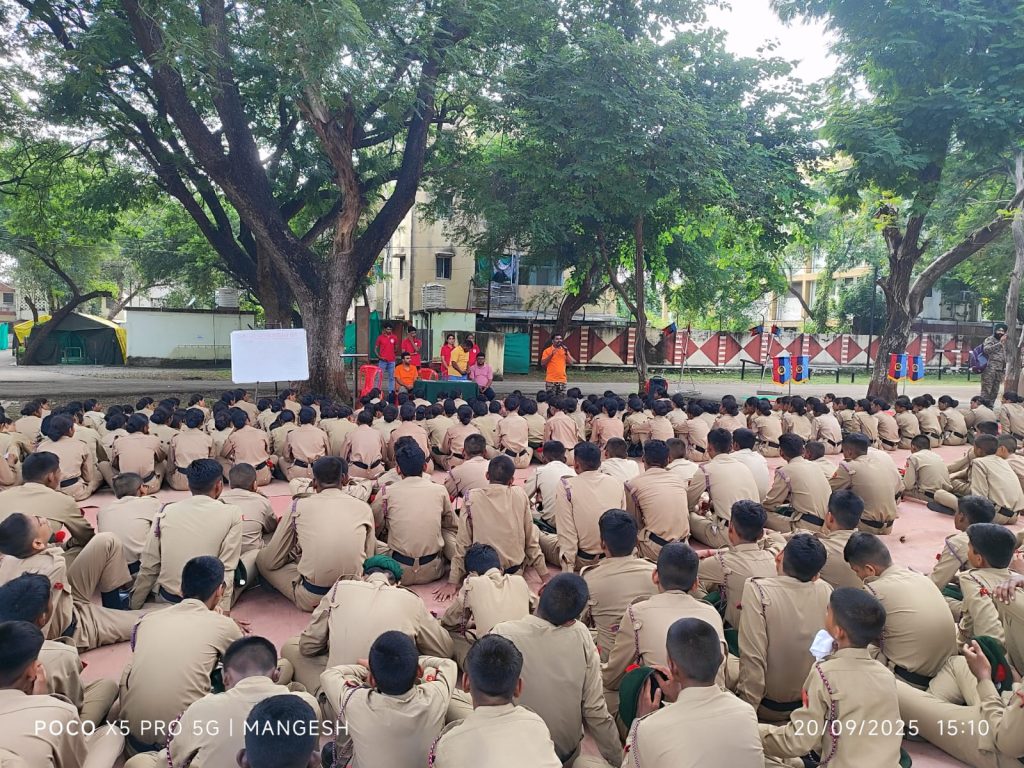 Disaster management trainers briefing NCC cadets on preparedness and emergency response during the Akola session.