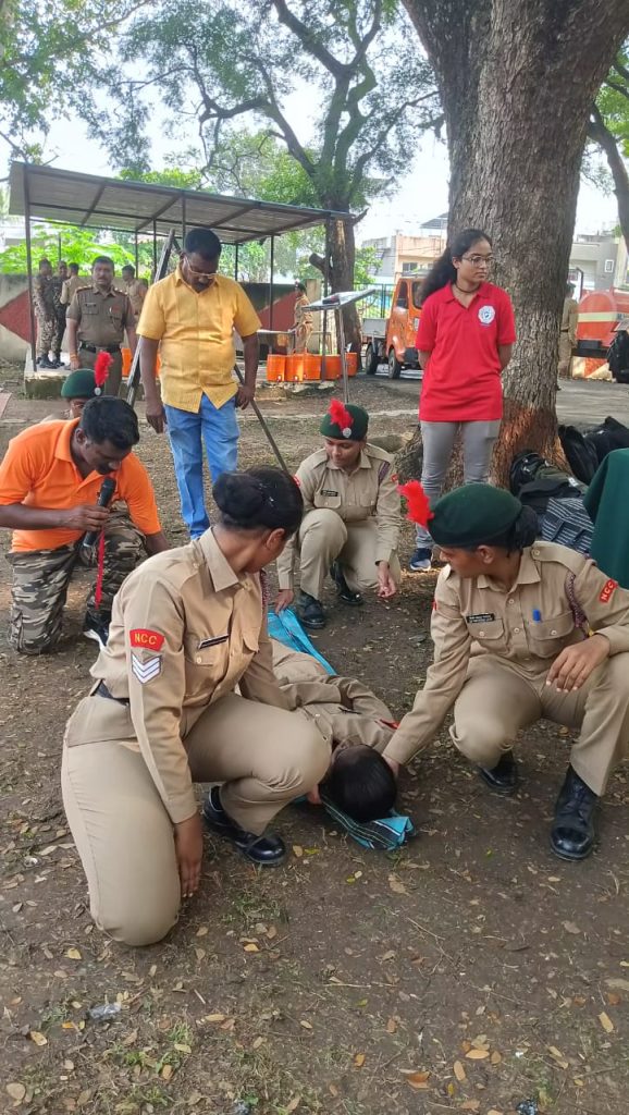 Hands-on disaster management demonstration where NCC cadets learned emergency bandaging and first response methods.