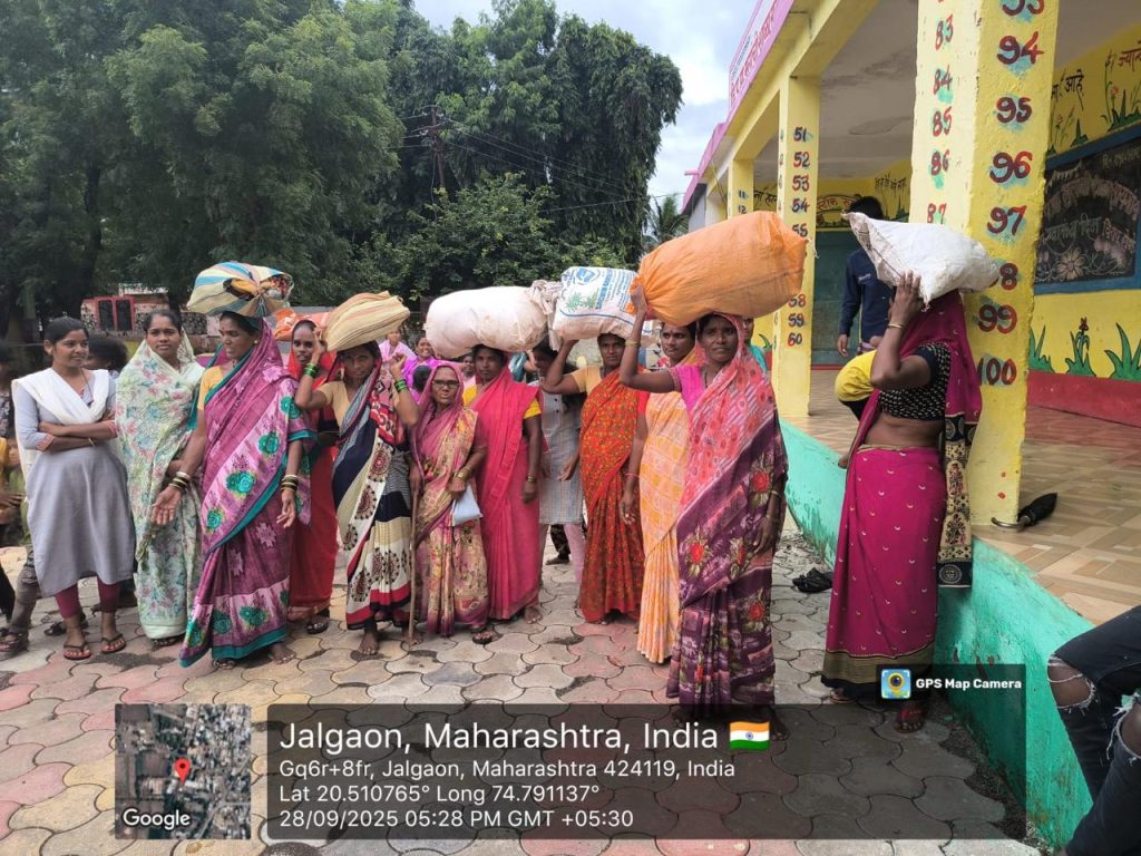 : सैगाव, जळगाव येथील महिलांनी आपल्या सामानासह सुरक्षितपणे गावातील निवारा केंद्रात स्थलांतर केले.
